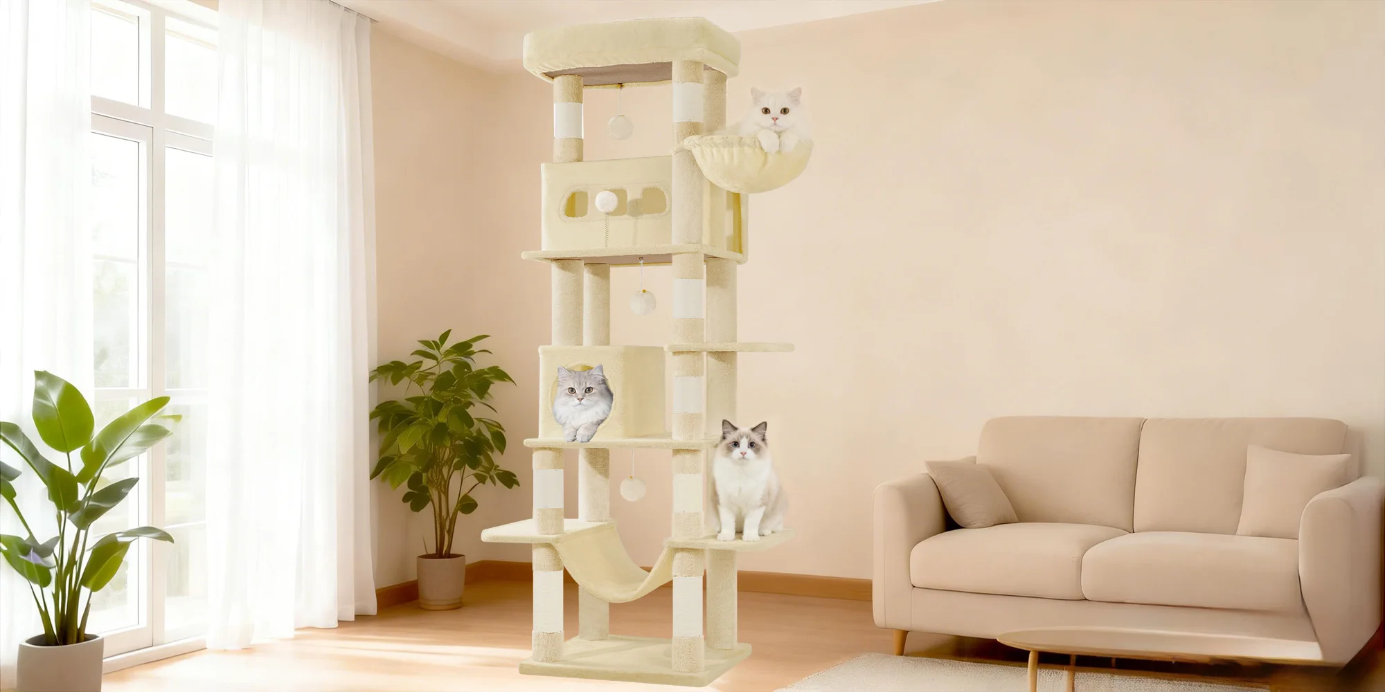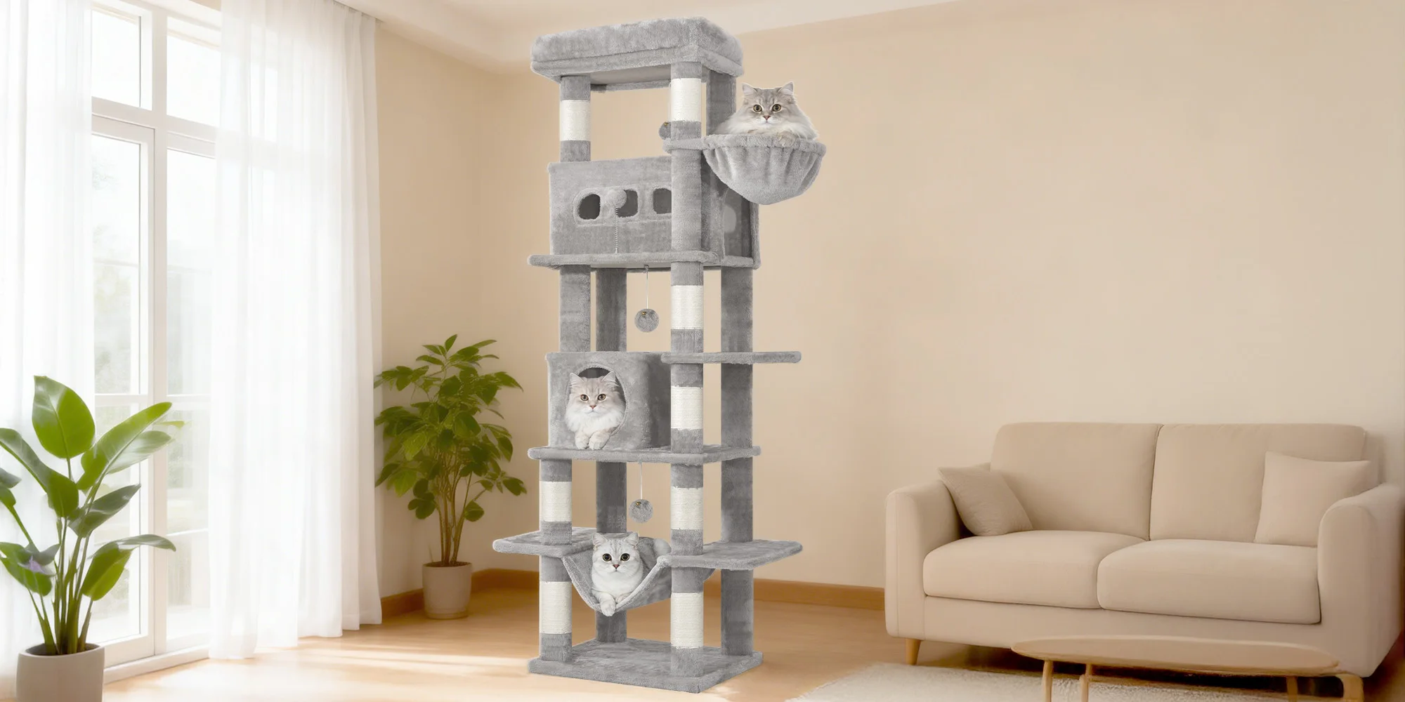 170 cm de haut avec 6 marches, 20 cm à 30 cm entre chaque plateforme. Ce griffoir moelleux est parfait pour les chats qui aiment grimper et les hauteurs, et il est également facile d’ascendre et de descendre.