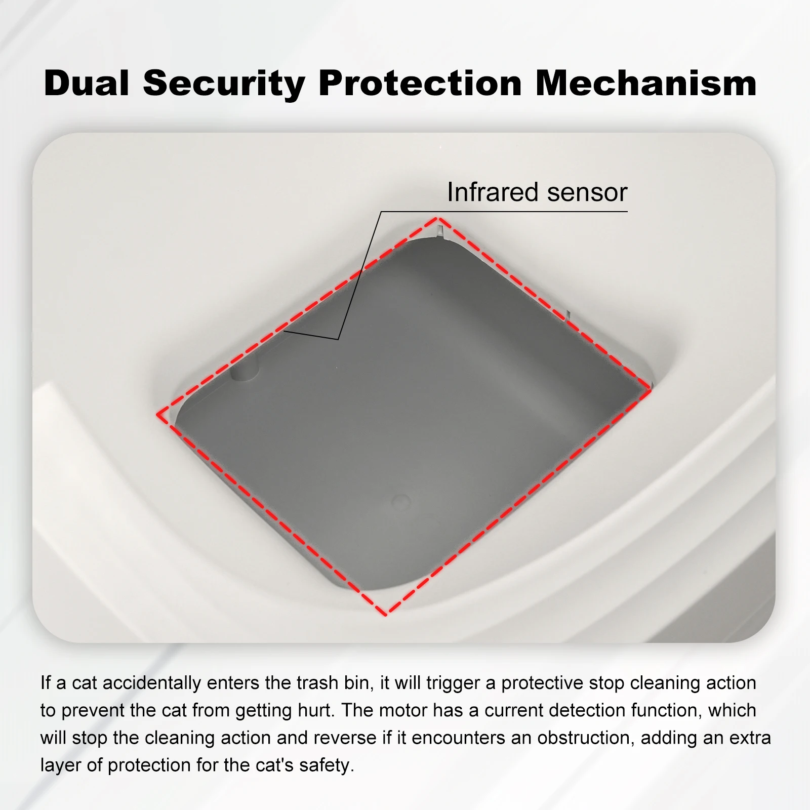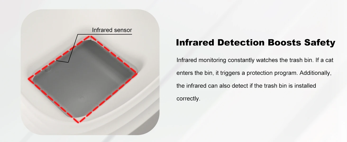 🛡️ Gardez votre compagnon en sécurité : sécurité alimentée par capteur pour boîte à litière automatique équipée de capteurs de gravité et de détecteurs infrarouges de haute précision, cette boîte à litière autonettoyante surveille l’environnement en temps réel.Il cesse de fonctionner immédiatement lorsqu’un chat est à proximité ou en mouvement, évitant ainsi les accidents et garantissant une utilisation sûre.