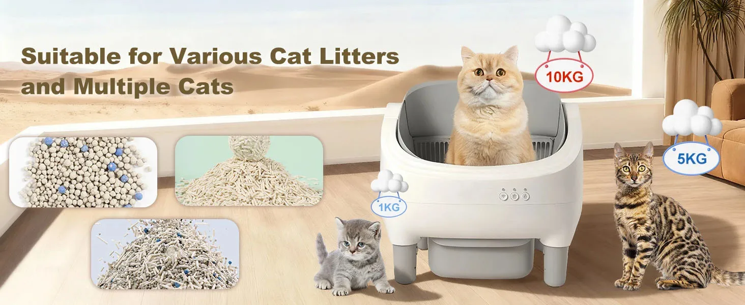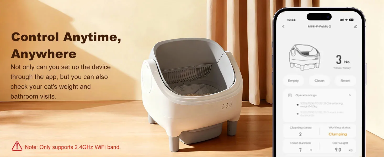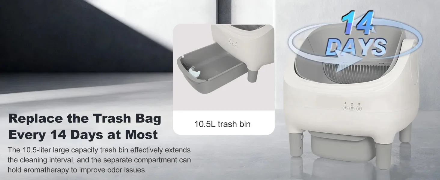 📲 Commodité contrôlée par l’application : connectez-vous via l’application intelligente dédiée pour surveiller les niveaux de déchets, recevoir des alertes de poubelle complète et suivre l’historique d’utilisation de votre chat.Ajustez les paramètres à distance et restez informé à tout moment et en tout lieu.⚠️ Remarque : prend uniquement en charge le Wi-Fi 2,4 G.