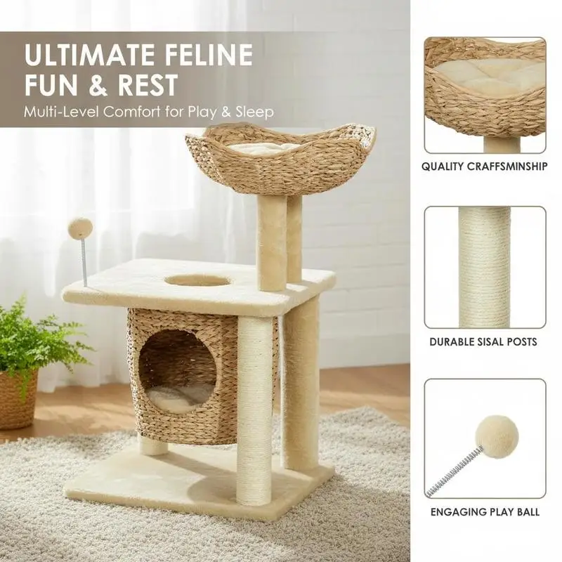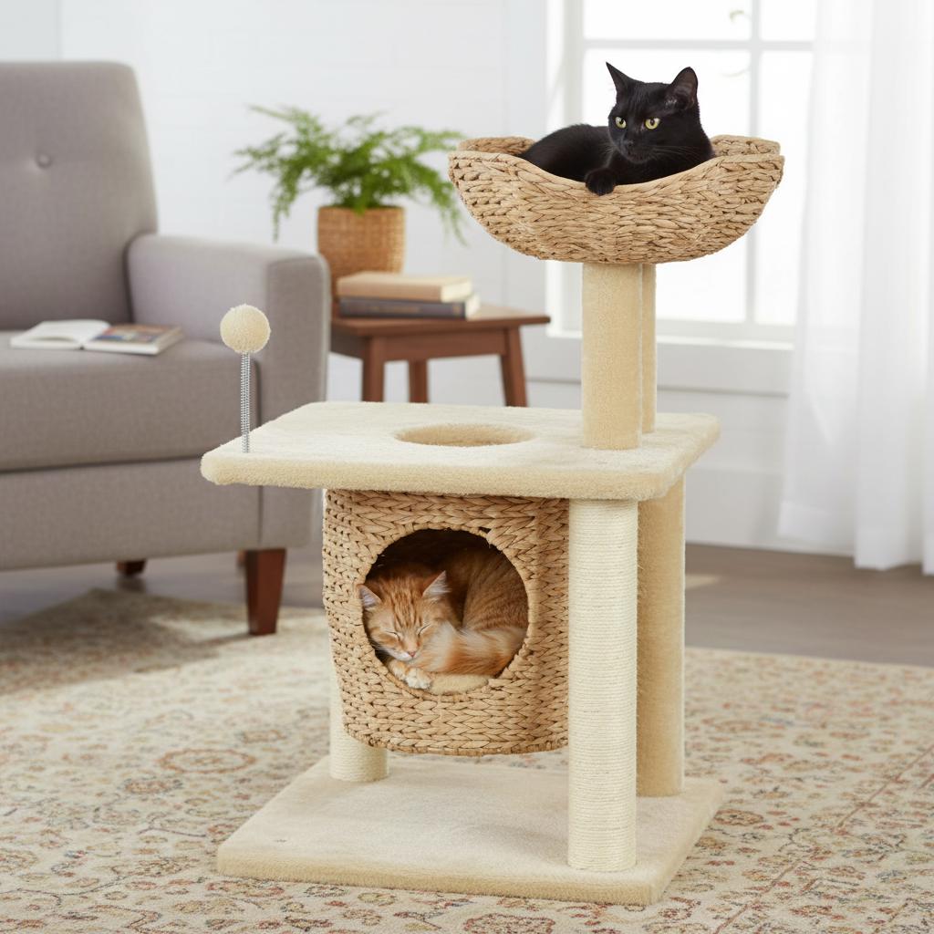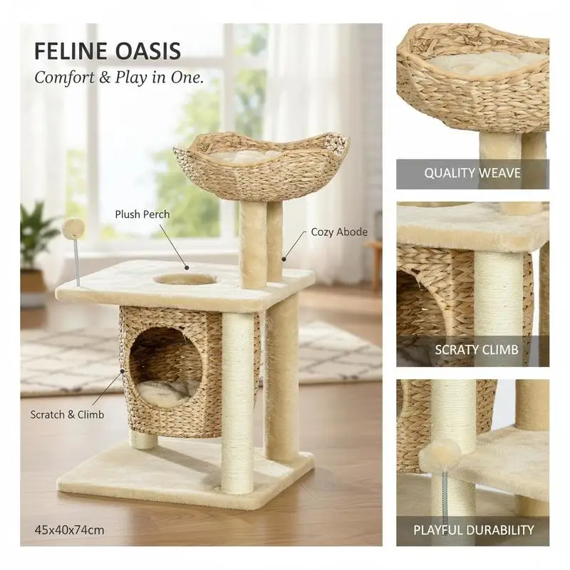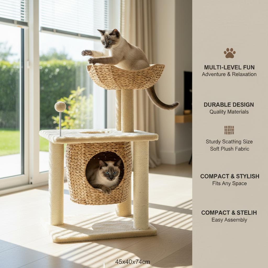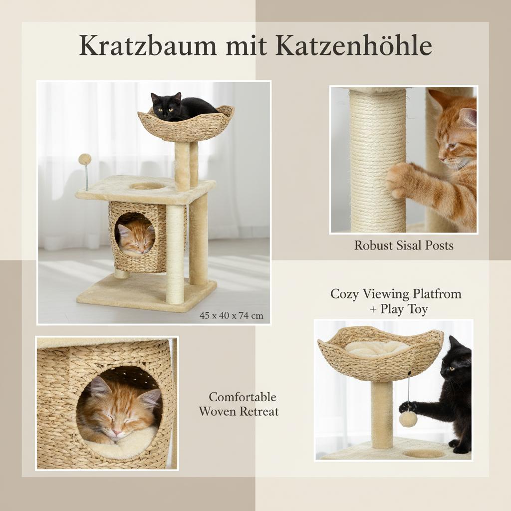 Cat tree with cat cave, lounging platform, play ball, 45x40x74cm, beige