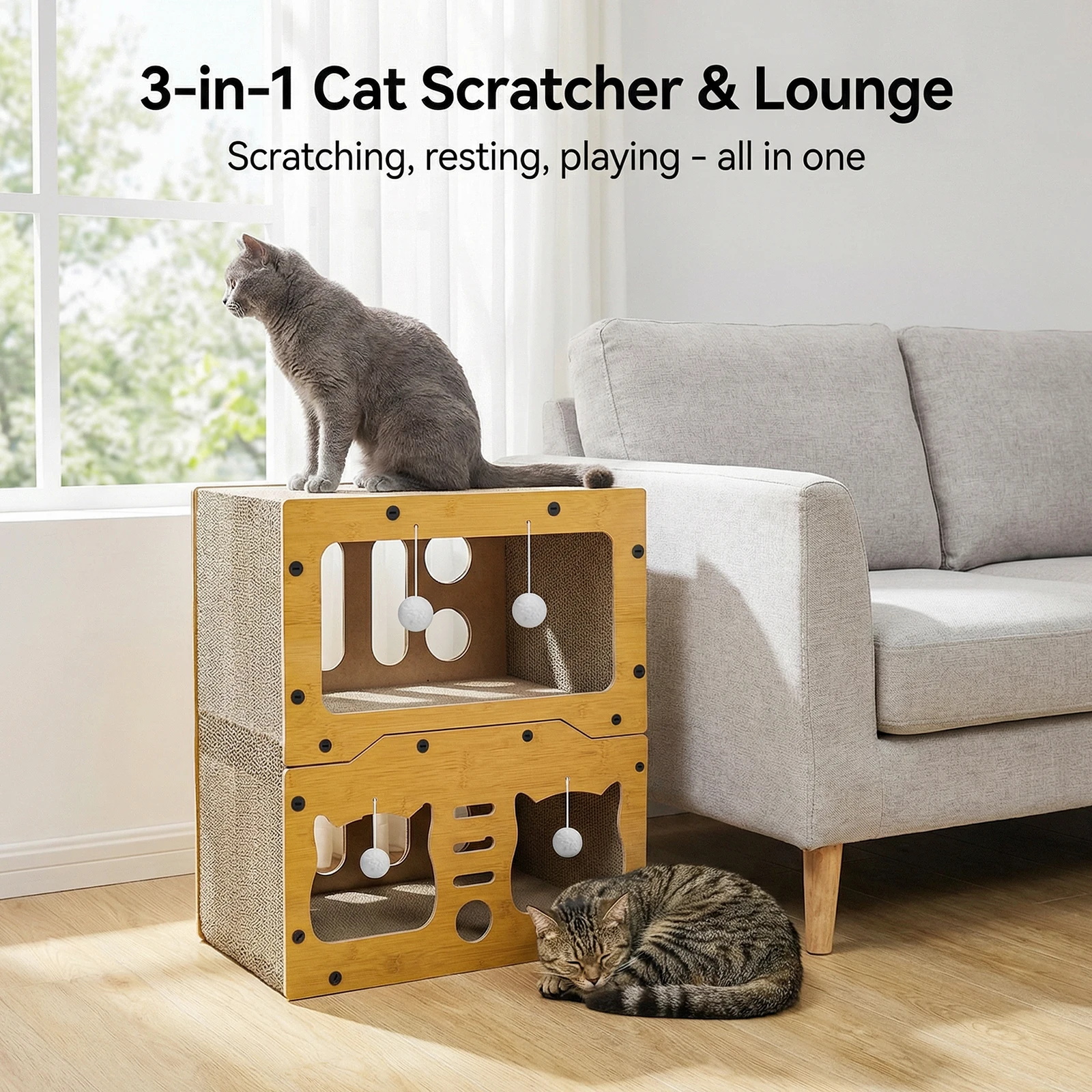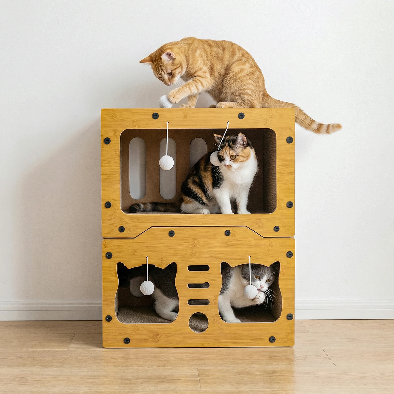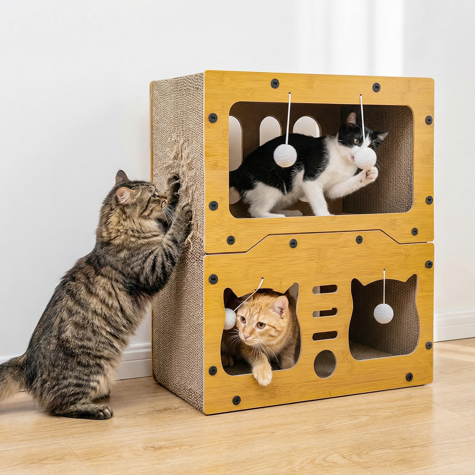 Structure stable : il est fabriqué en carton haute densité respectueux de l’environnement et possède une structure solide pour garantir la sécurité des chats lorsqu’ils sautent et grimpent. La conception à trois niveaux permet à plusieurs chats de l’utiliser simultanément, leur offrant ainsi la liberté d’explorer et de profiter d’un divertissement plus interactif.