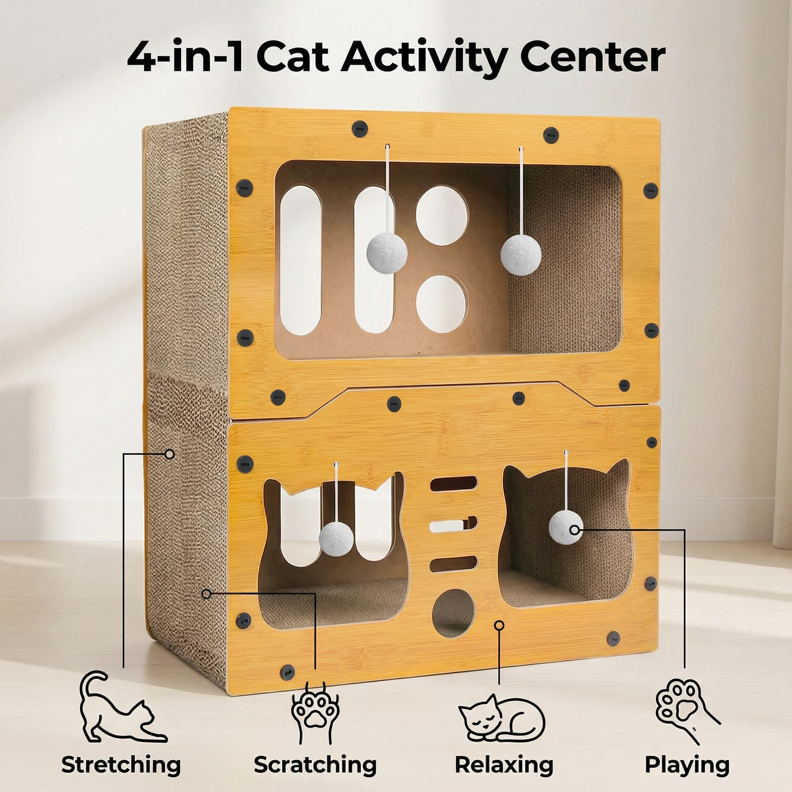 Vie saine : grâce aux activités de grattage et d’escalade, il aide les chats à faire de l’exercice, à évacuer le stress et à améliorer leur vitalité et leur équilibre globaux. Un centre d’activités intérieur adapté aux chats de petite et moyenne taille, c’est un choix idéal pour chouchouter votre chat.