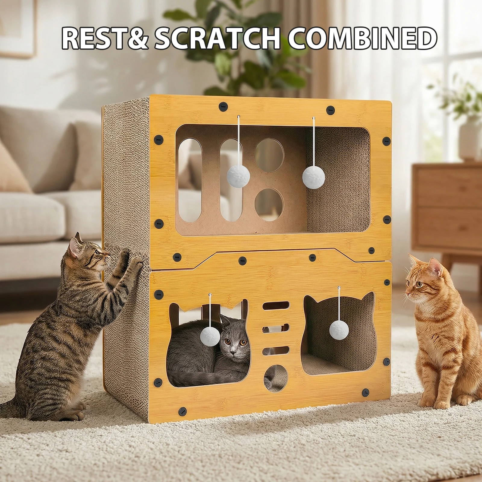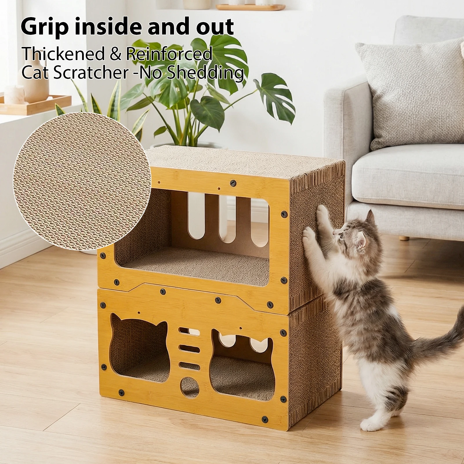 Créez un cocon douillet : la forme de maisonnette imitation intérieur offre un sentiment de sécurité aux chats. Le matériau en carton ondulé est non seulement doux et confortable, mais il permet également de satisfaire l’instinct naturel du chat de griffer. Que ce soit pour faire la sieste, se cacher ou aiguiser ses griffes, c’est leur coin idéal.