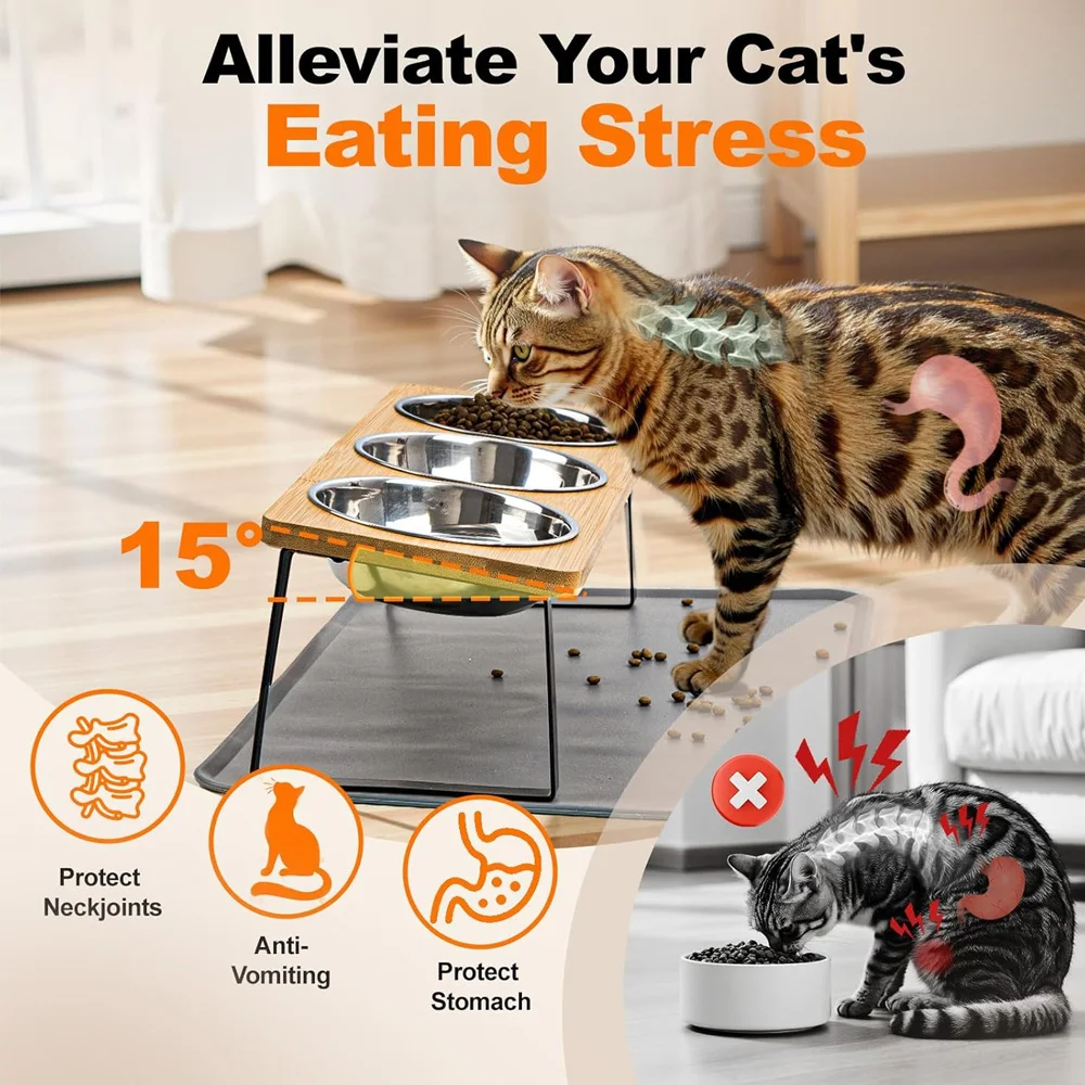 1. Protection de la colonne cervicale – La hauteur surélevée s’adapte à la posture de manger du chat, plus besoin de se pencher, particulièrement adapté aux chats âgés ayant des problèmes articulaires.