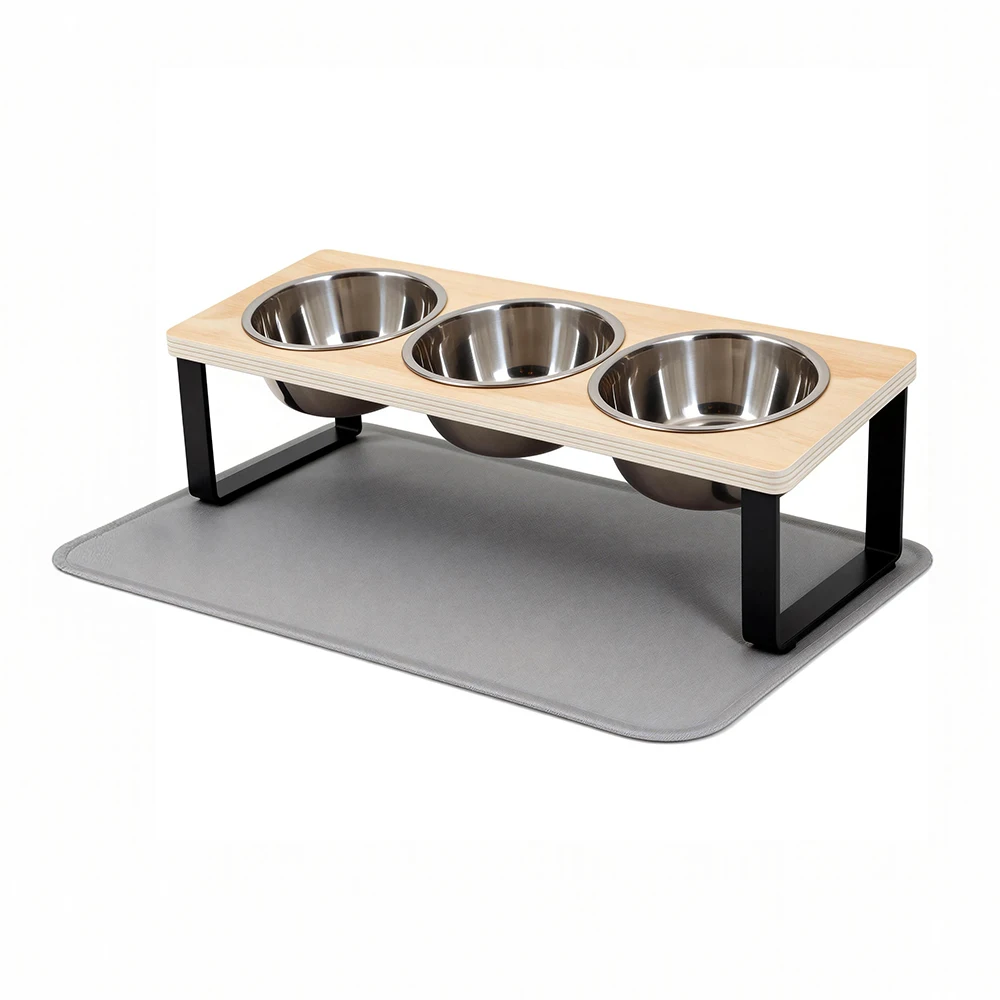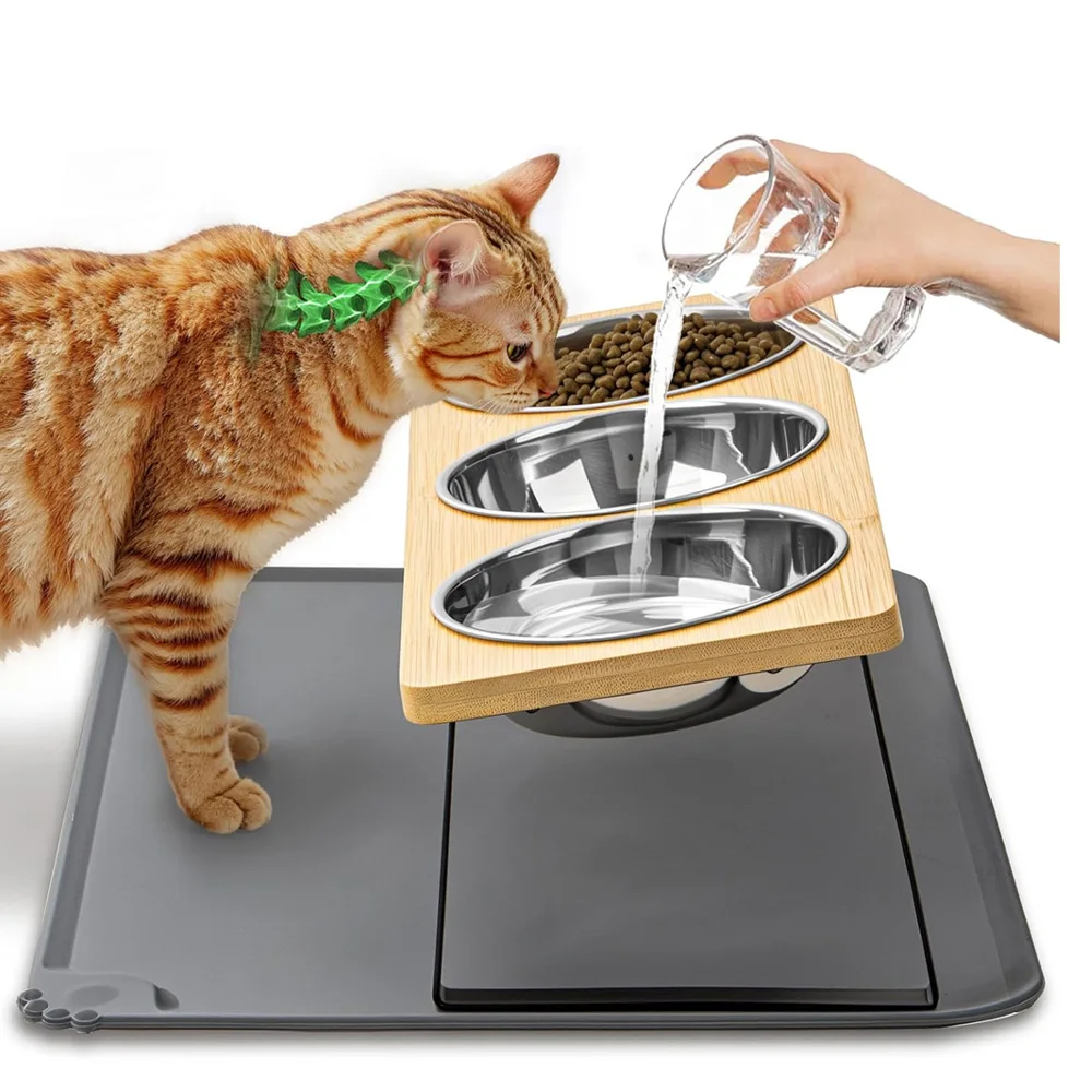 Support pour 3 bols à chat, structure en fer, distributeur de nourriture surélevé, tapis en silicone pour bol à chat, tapis d’alimentation imperméable et antidérapant pour chats